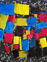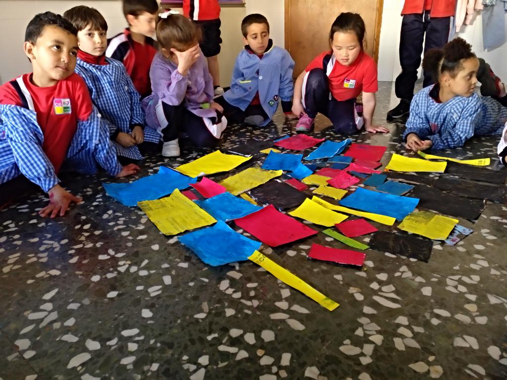Els alumnes de 1r treballen l'artista holandès Piet Mondrian a partir del concepte de color primari i forma geomètrica. Transformen la tendència de l'artista per a crear una obra col.laborativa que pretén donar a conèixer la idea d'habitacle amb espais propis: menjador, cuina, jardí...