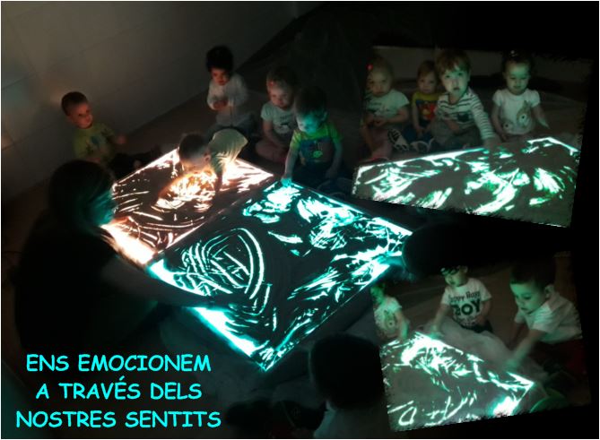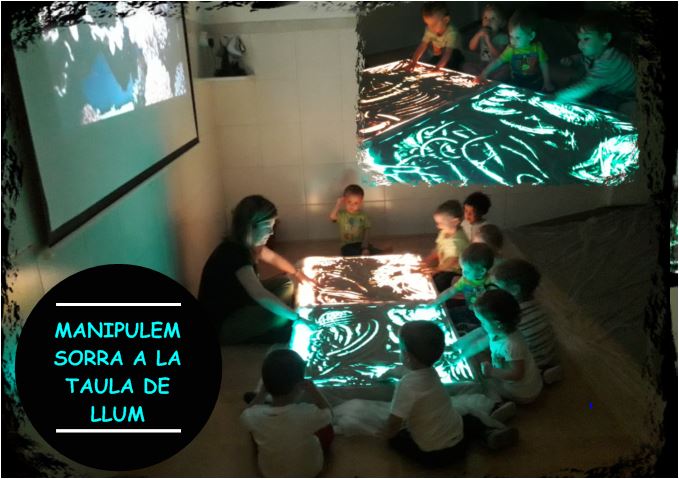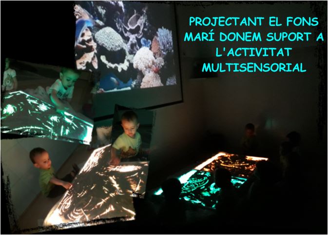 Aquesta setmana els nens i nenes de la llar d'infants hem simulat el fons marí a les nostres sessions snoezelen dins la nostra aula. Amb el suport d'un video que ens transportava al fons marí, hem manipulat sorra a les taules de llum ambientades amb colors per l'ocasió.