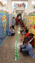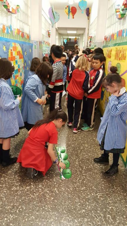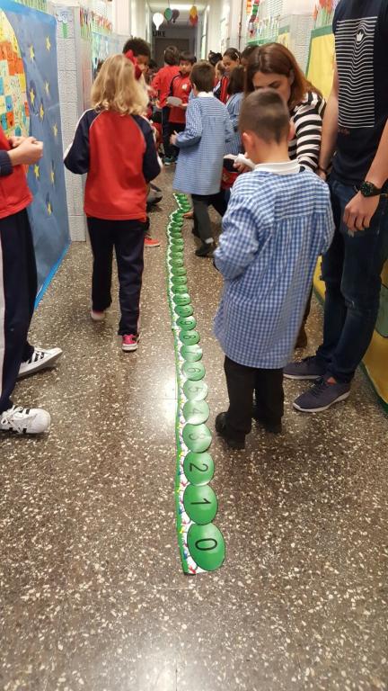 Avui els nens i nenes de 2n i 4t de primària hem construït plegats una recta numèrica molt original en forma de cuc. Primer hem agafat aleatòriament els números del 0 al 100 i despés i entre tots hem anat ordenant i col.locant els números tot construïnt un cuc ben gran fins al 100!